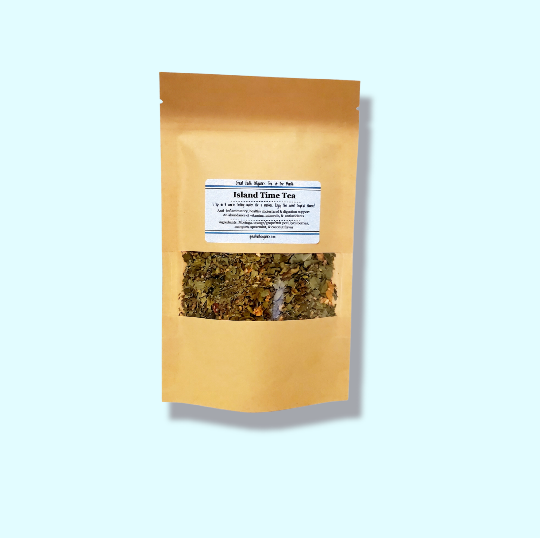 Island Time Herbal Tea Blend - Has dominant flavors of mango, lycii berry, and coconut, our island time herbal tea blend is sure to make you feel like you’re on a tropical vacation This tea is delightful any time of day. organic ingredients: ceylon tea, assam tea, guayusa tea, calendula, lycii berries, lemongrass, mangoes, coconut flakes, mango and coconut flavoring. 20 servings