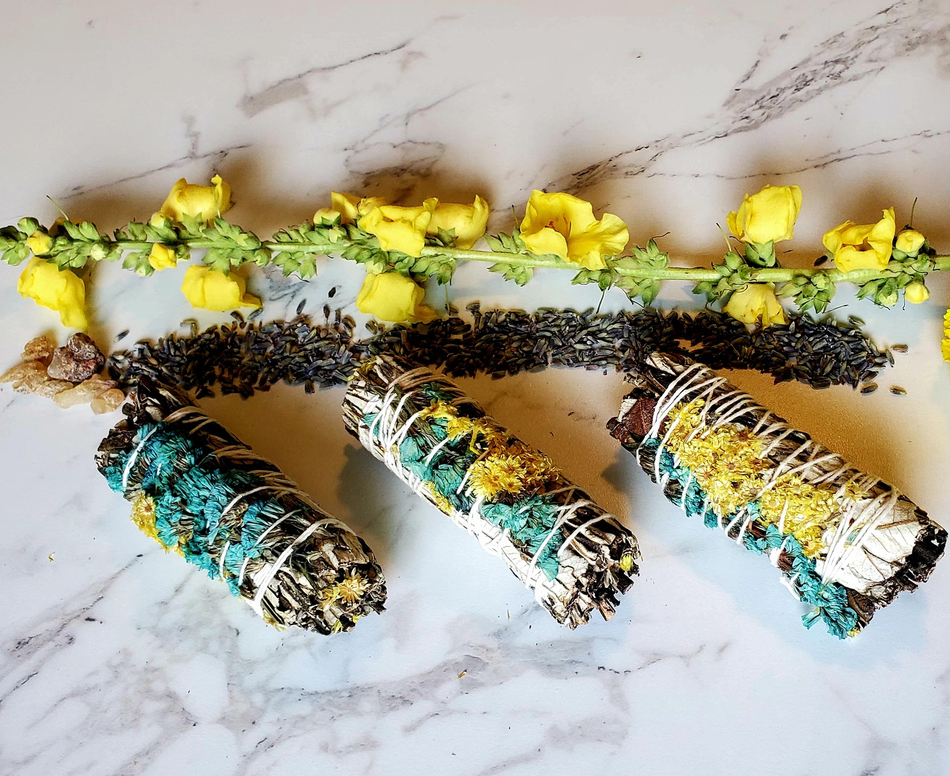 Yerba Santa floral sticks. Yerba Santa is an herb that is commonly used for protection and boundaries. It brings courage and helps to release emotional pain from the heart center. For this reason, it is beneficial for those experiencing grief, melancholy, depression, or despair. It is great for self-care practices and for increasing self-love. It is also believed to help aid in enhancing ones spiritual abilities. These are wrapped in lovely, fragrant yellow and blue flowers.ย